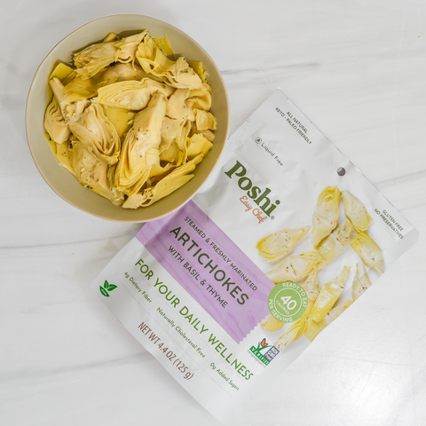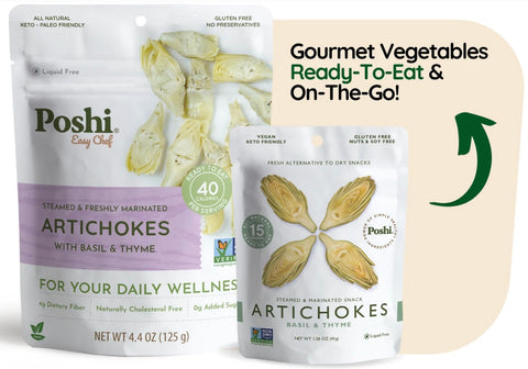 Poshi stands for "Power Of Simple Healthy Ingredients." It is simply all-natural premium veggies made easy! - lightly marinated with Mediterranean herbs, peeled, and steamed to maintain texture and easy digestion.