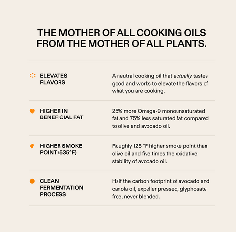 Light, slightly buttery, and endlessly versatile. As the mother of all plants, algae produces a supremely pure culinary oil with the highest smoke point and 13g of heart-healthy Omega-9. "I can't stop using it." – Food & Wine.