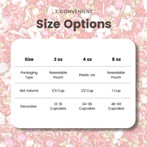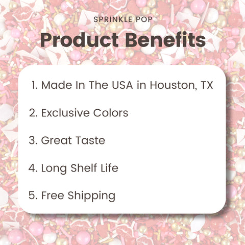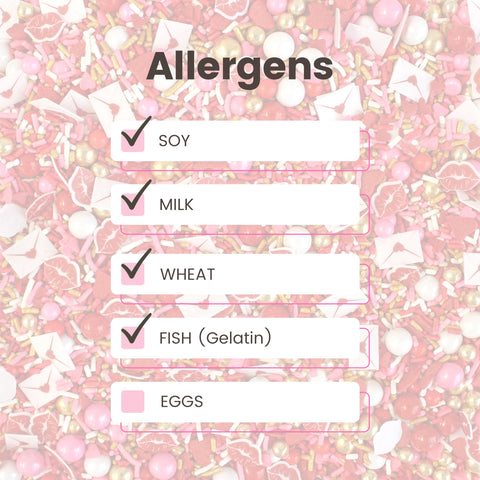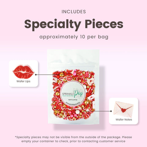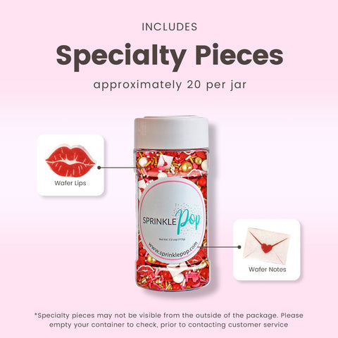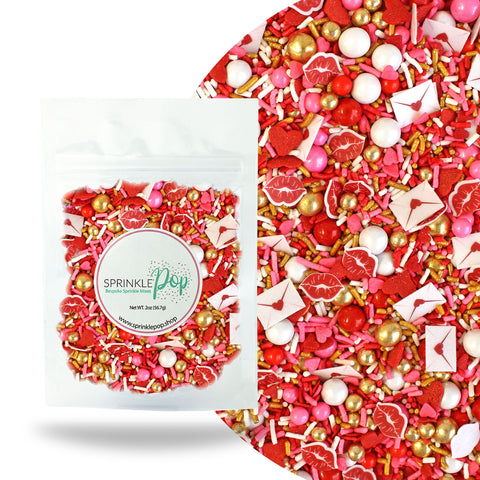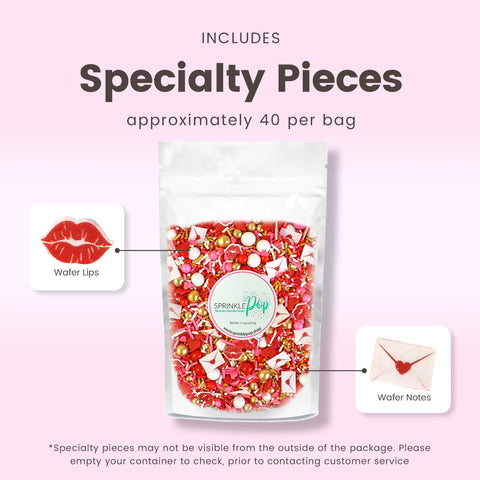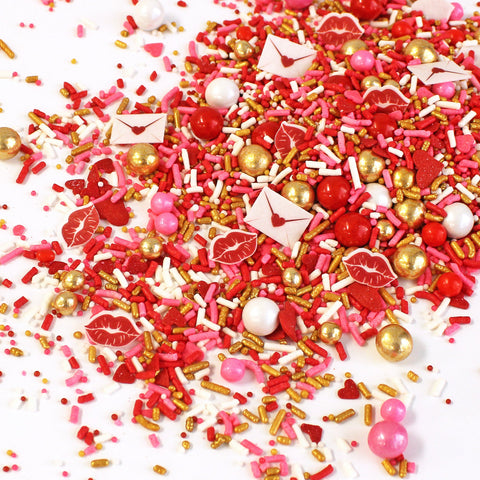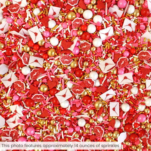 Pucker up and get ready for this season's most heart-throbbing sprinkle blend. Cupid's Kiss is full of blood-pumping reds and warm golden tones giving it a luxe yet playful vibe! The wafer paper love letters and pouty lips will add the perfect accent to your treats. Oh and did we mention those large golden dragees are made of CHOCOLATE