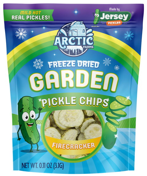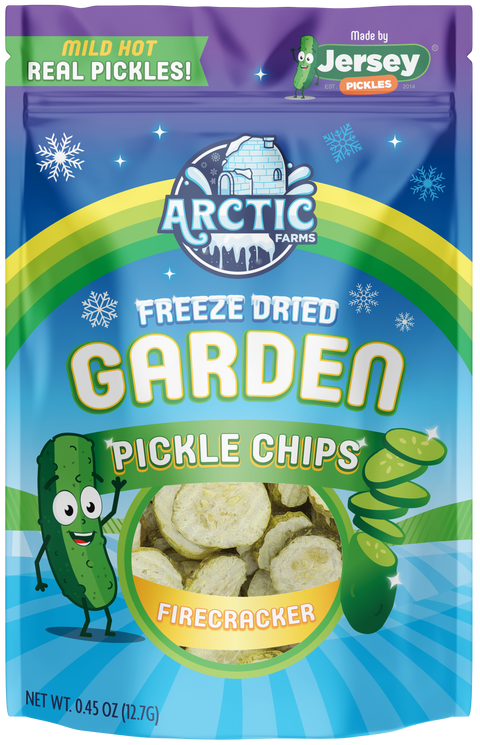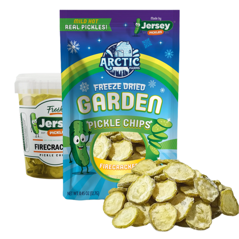 Indulge in the ultimate snack with our mouth-watering Freeze Dried Pickle Chips, crafted from real pickles! These irresistibly crunchy and addictively tasty chips are sure to satisfy your cravings and leave you craving more. Whether enjoyed straight from the bag or added to sandwiches, the options are limitless. Don't pass up on the sensational flavor of our mild hot pickle chips - the perfect amount of spice to add some excitement to your day. Expertly created by Jersey Pickles and freeze dried to perfection by Arctic Farms.