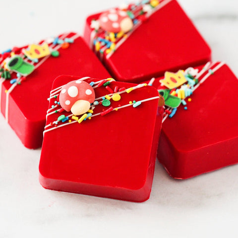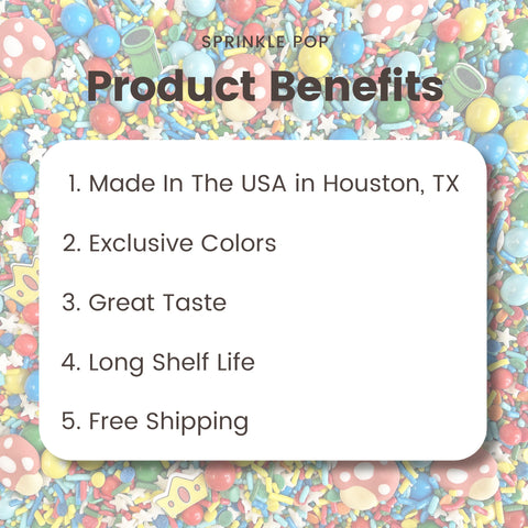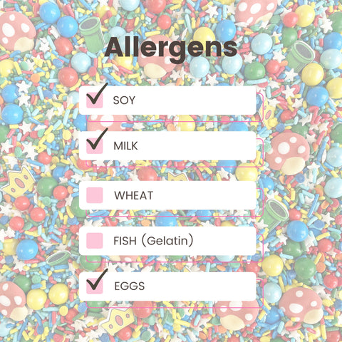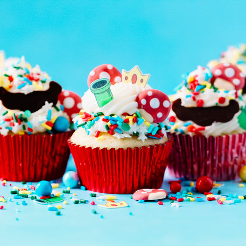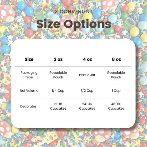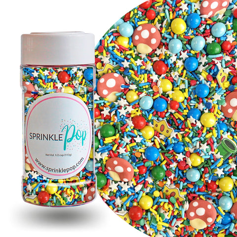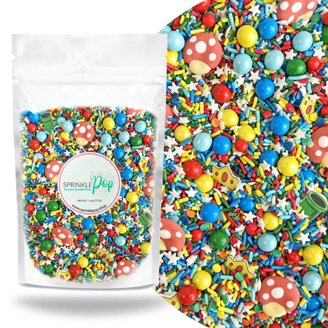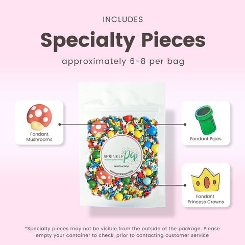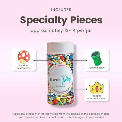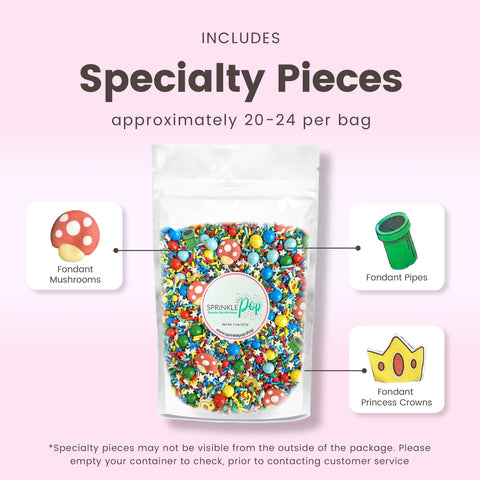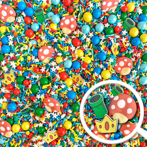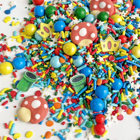 The highlight of this sprinkle mix are the adorable royal icing mushroom caps and wafer paper green pipes and princess crowns. They're the perfect addition to your baked goods for a fun and playful touch.
