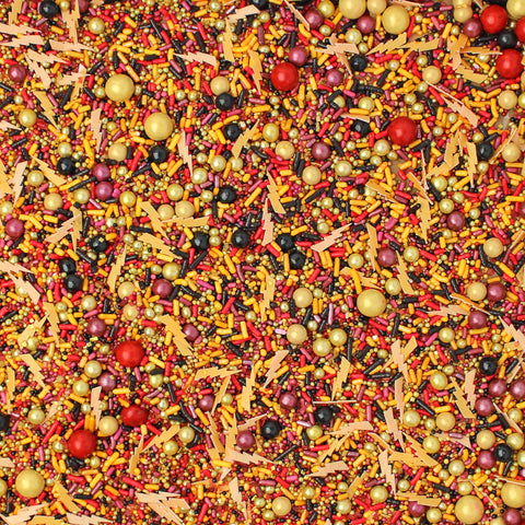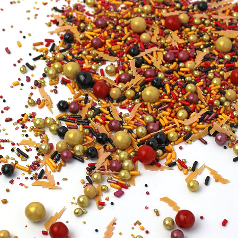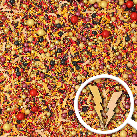 Our Mischief Managed sprinkle mix will cast a spell on you. This wizarding sprinkle mix is a blend of burgundy, red, yellow, and black with metallic gold accents and wafer paper lightning bolts.