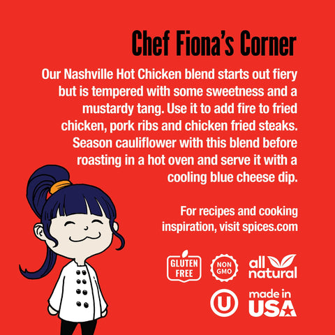 ALL-PURPOSE NASHVILLE HOT CHICKEN: Perfect for chicken, pork, vegetables and buttered popcorn, this versatile fiery, sweet and tangy seasoning goes well with just about anything. A pantry staple, it's the perfect blend for spice lovers.