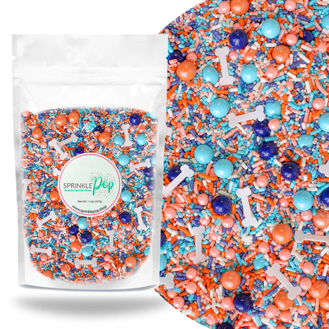 Oh Biscuits! Sprinkle Mix is a delightful assortment of cake decorating and edible decor. Designed specifically for bakers, this sprinkle mix features a vibrant blend of blue and orange colors, along with specialty wafer paper dog bones. Perfect for adding a touch of whimsy to your cakes, cookies, ice cream, and cupcakes, this mix offers a variety of shapes and colors to make your creations truly pop.