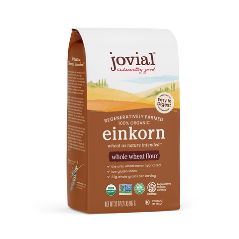 Made from nature's original wheat, einkorn has remained untouched by modern hybridization and large-scale agriculture for 12,000 years. Einkorn is fast becoming the wheat of choice for the gluten sensitive due to its very weak gluten. Einkorn whole wheat four is 100% of the freshly milled grain. Bake beautiful bread, cakes, muffins, and cookies with Jovial's Organic Einkorn Whole Wheat Flour—it’s much easier to work with than gluten free flour.