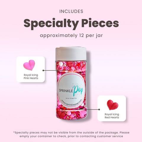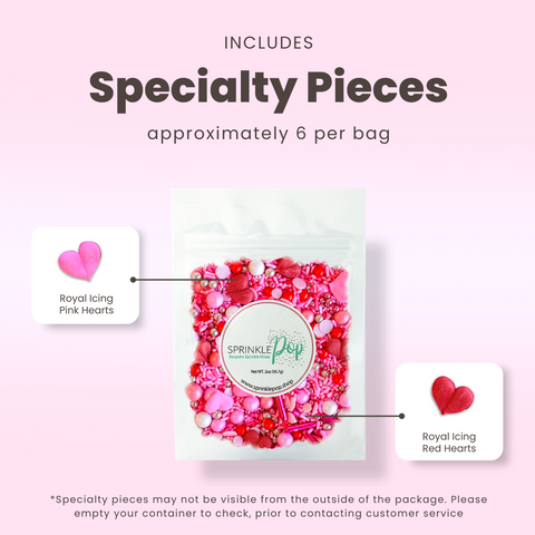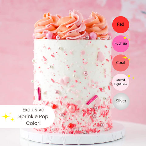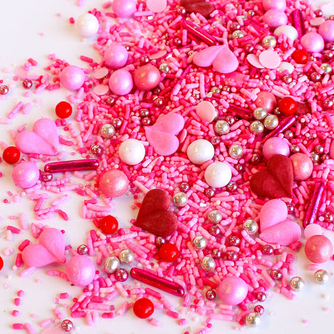 Oh Cupid, not again! You got me straight in the heart with this charming pastel blend of soft pink, coral, and red sprinkles with hot pink and silver metallic dragees, and the sweetest of sweet royal icing heart sprinkle pieces. I’m hook, line, and sinker!