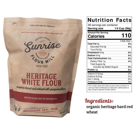 This white flour is milled from organic Turkey Red Heritage Wheat Berries. It is a fine, naturally dazzling white all-purpose flour. The color comes from the natural white color of the wheat's endosperm, not from bleaching making this a naturally unbleached flour. Because this is a heritage wheat, it contains a type of gluten that many people with gluten intolerance find to be more digestible. You won’t believe how silky soft and smooth this all-purpose flour is and how easy it is to bake with. It works exceptionally well for everything – bread, pastries, cookies, cakes, pie crust, pasta, pizza crust – a truly all-purpose flour.